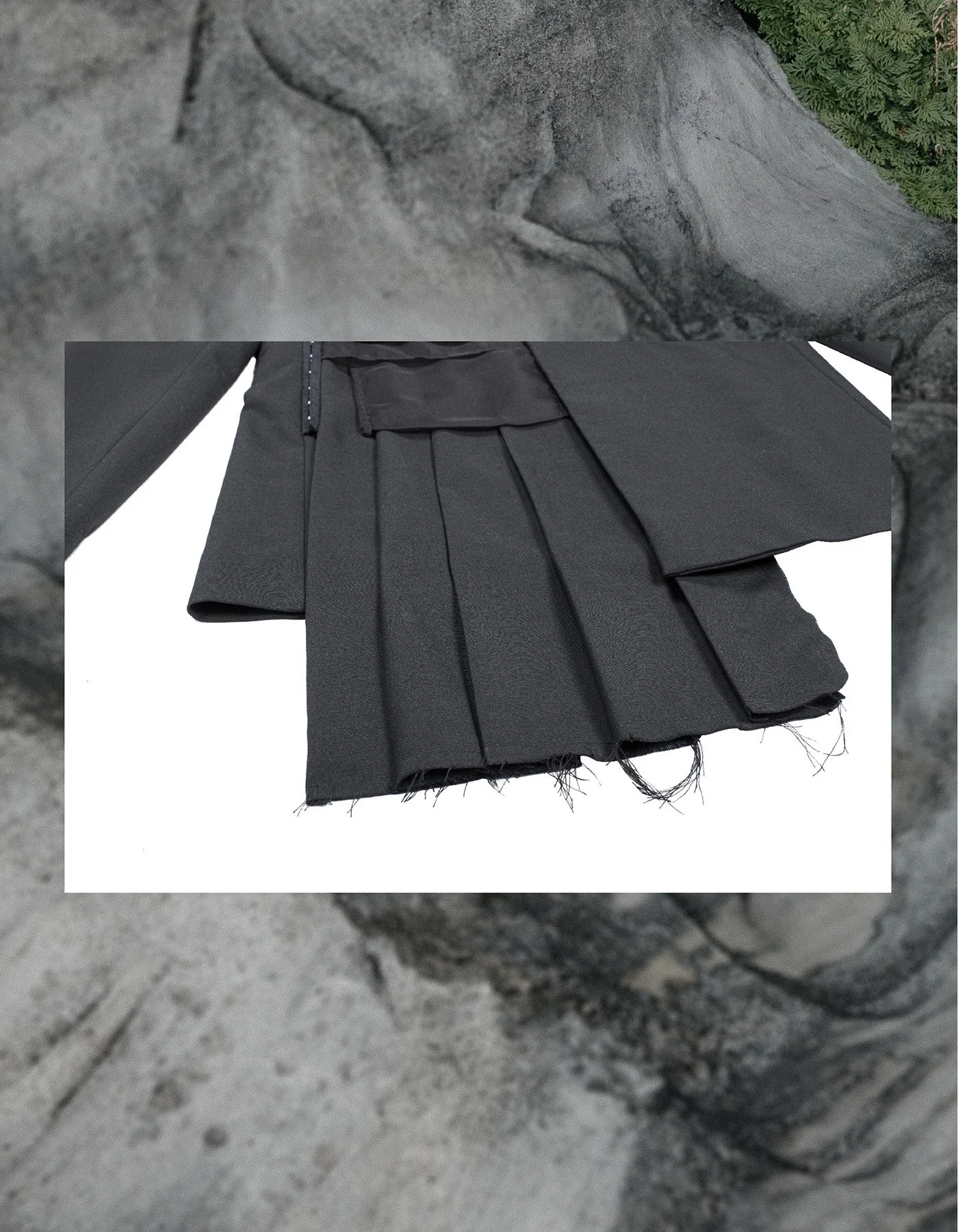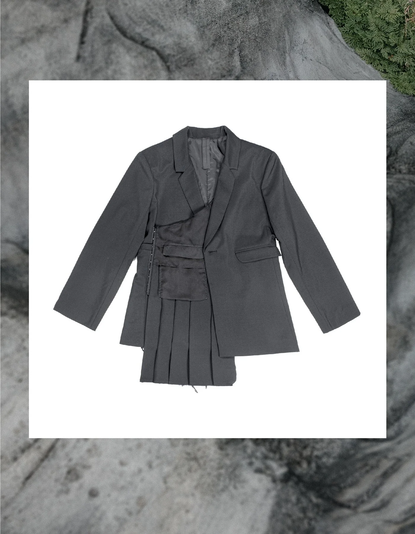 The cutting is based on formal suit jacket. A flap is extended from the left front after deforming and reshaping the formal jacket with pleated skirt. The under layer looks like pleated miniskirt and a deconstructed pocket is added on the outside to form layers to the garment. The flap is movable, it can be fixed to the bodies through fastening the hook and eyes to become a layer to the jacket. The flap will come to the side body when the hook and eyes are unfastened because of weight. Two functional pockets are added and a slit on the back not only provides ease for movement, but also prevents the hem of the suit from covering the hips too much and causing excessive wrinkles.