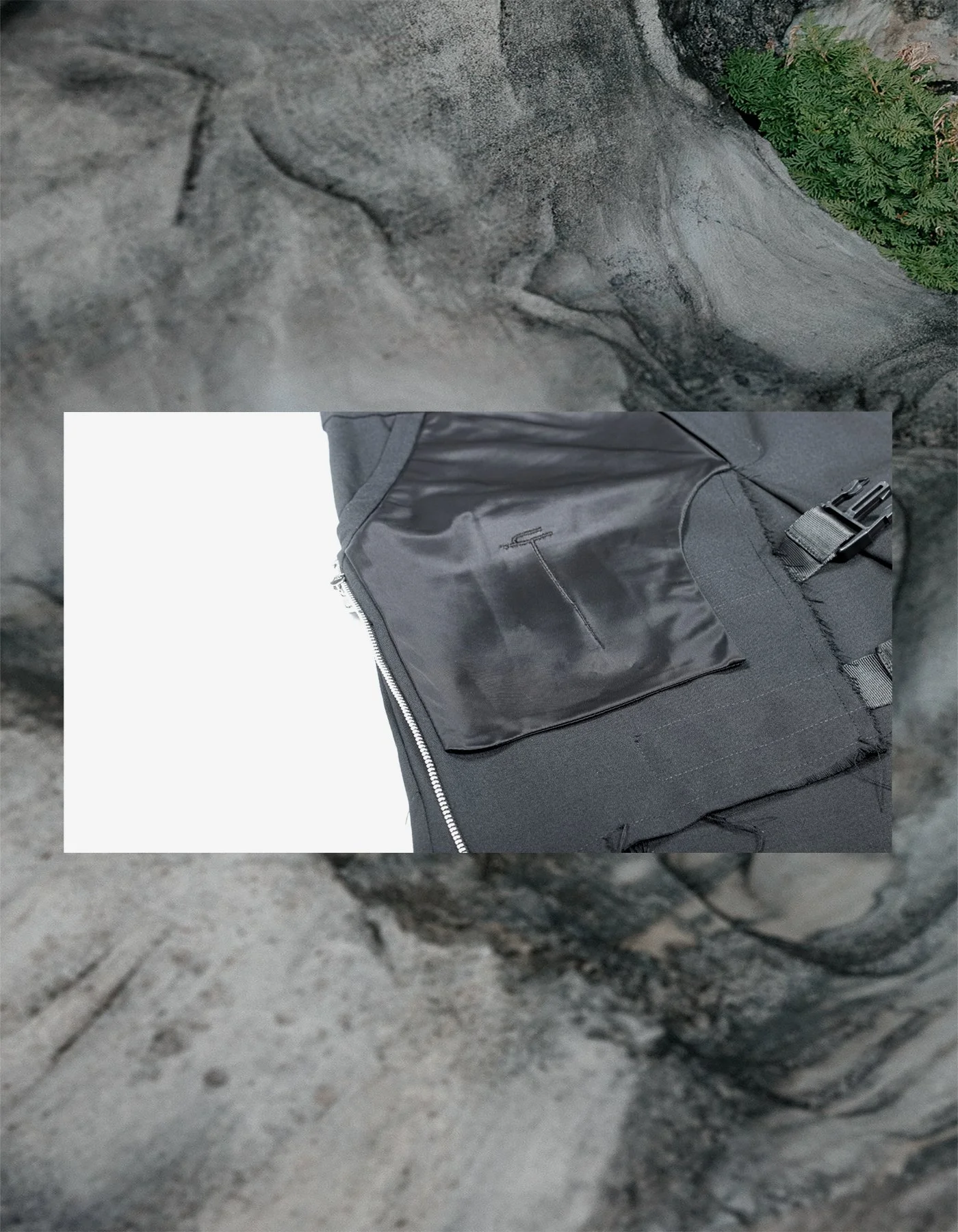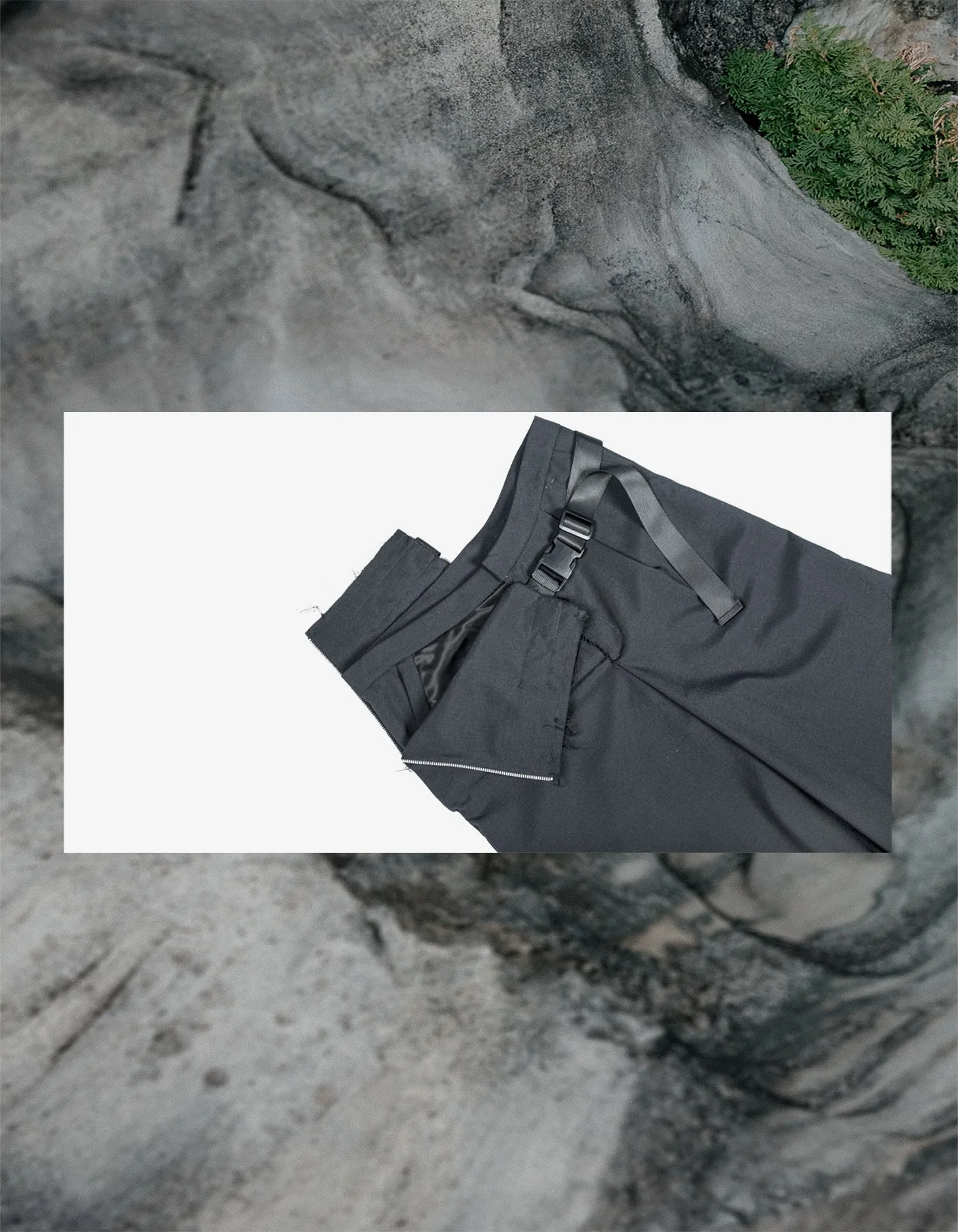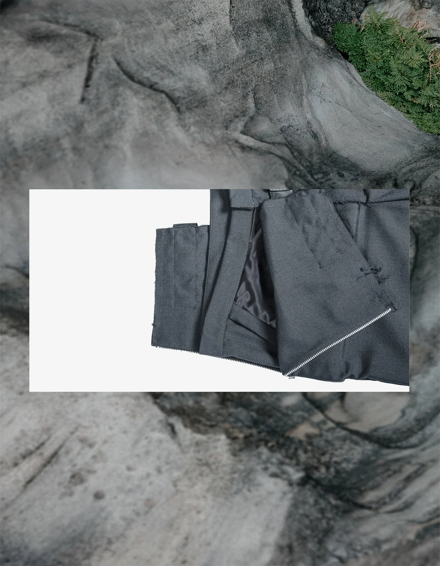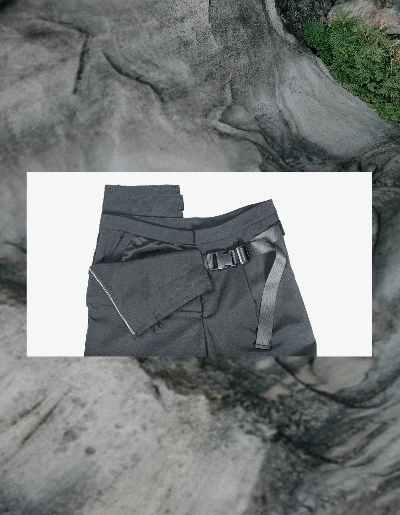 A deformable flap is extended from the waistband and two adjustable belts are added on the flap. The belts can be fixed between legs or leave them fall freely on the outside as a decoration detail. The flap can be rolled upside and zip up to become a waistcoat-like form and the belts can be fixed on the waist, when the flap falls freely it can be a decorative fake pocket.The flap is also made from Japanese satin fabric which creates a difference in fabrication too.