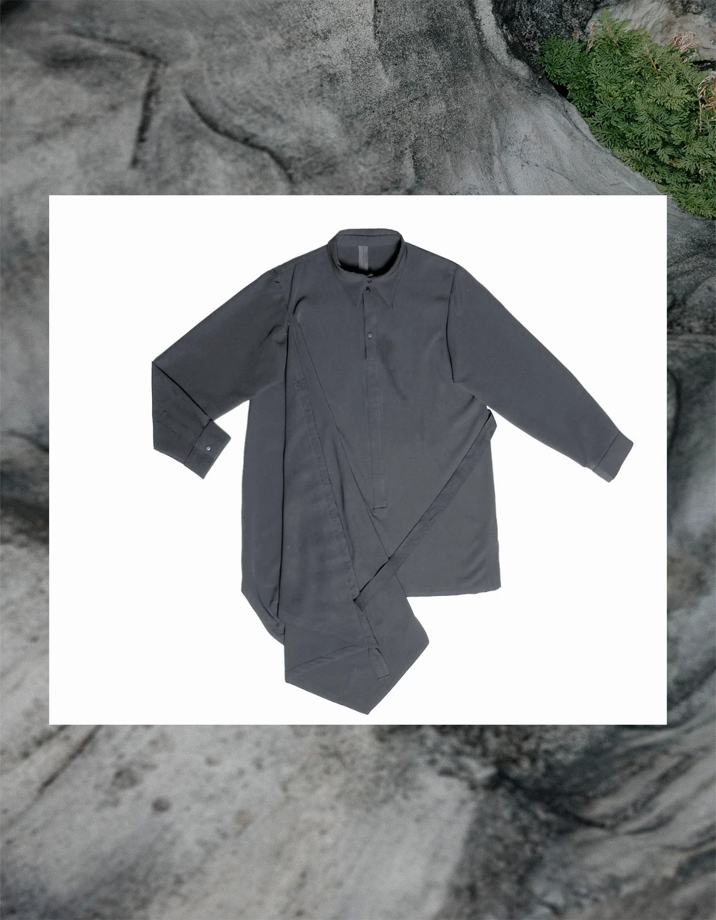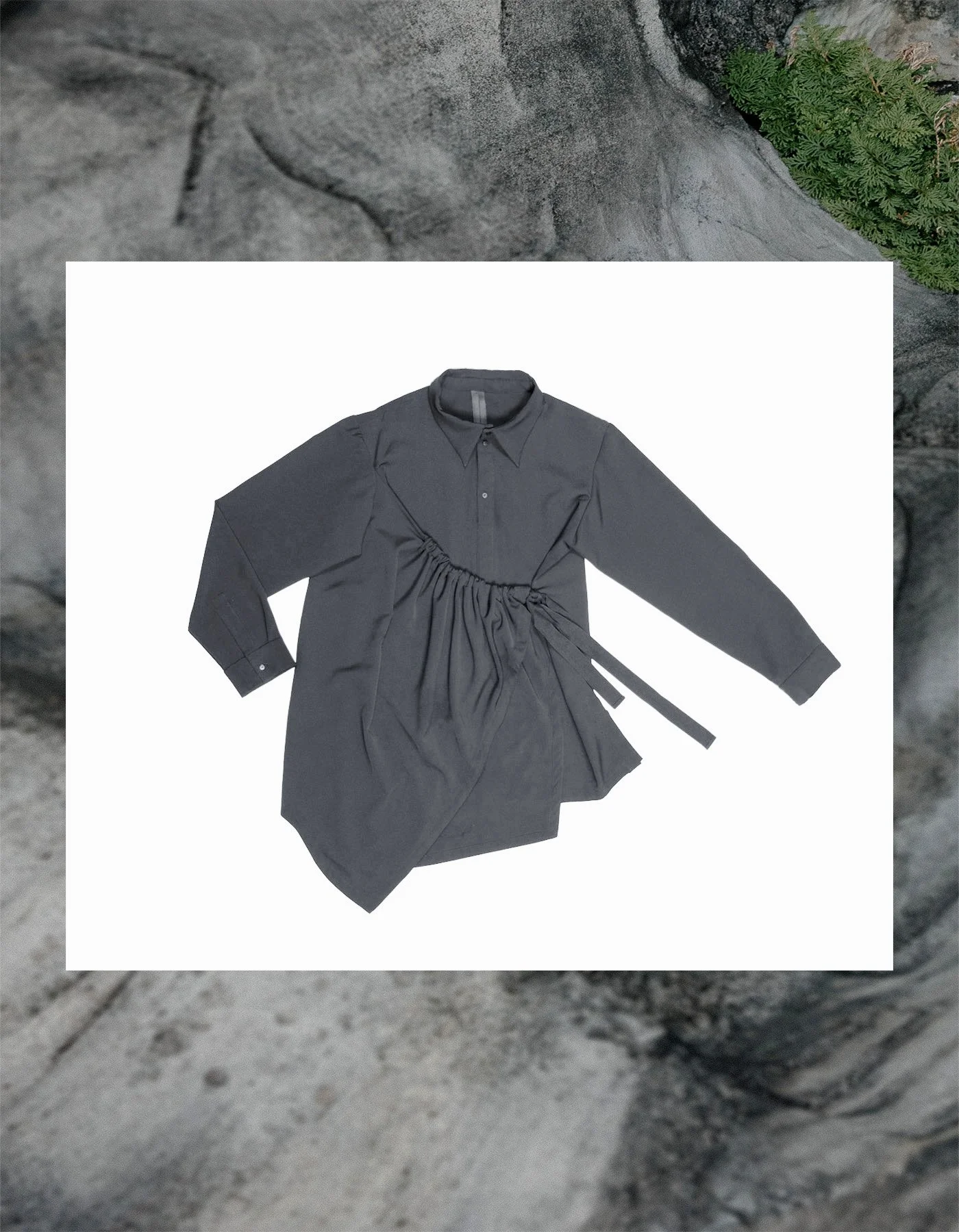 The cutting of the shirt is oversized, it not only allows the shirt to keep the looseness and rebellious visually in oversized design, but also can make you look slimmer and make it look like a classic formal shirt. The expanded bodies create the volume for draping naturally and asymmetrical design visually. Drawstring detail is added to the expanded side too to provide a free decision in styling: you can gather the fabric and tie the webbing on the waist to create a layered shirt with gathering detail, or leave it to make it become an elegant long shirt. The slits on the hem on both sides make reaching the pockets on the pants easier.