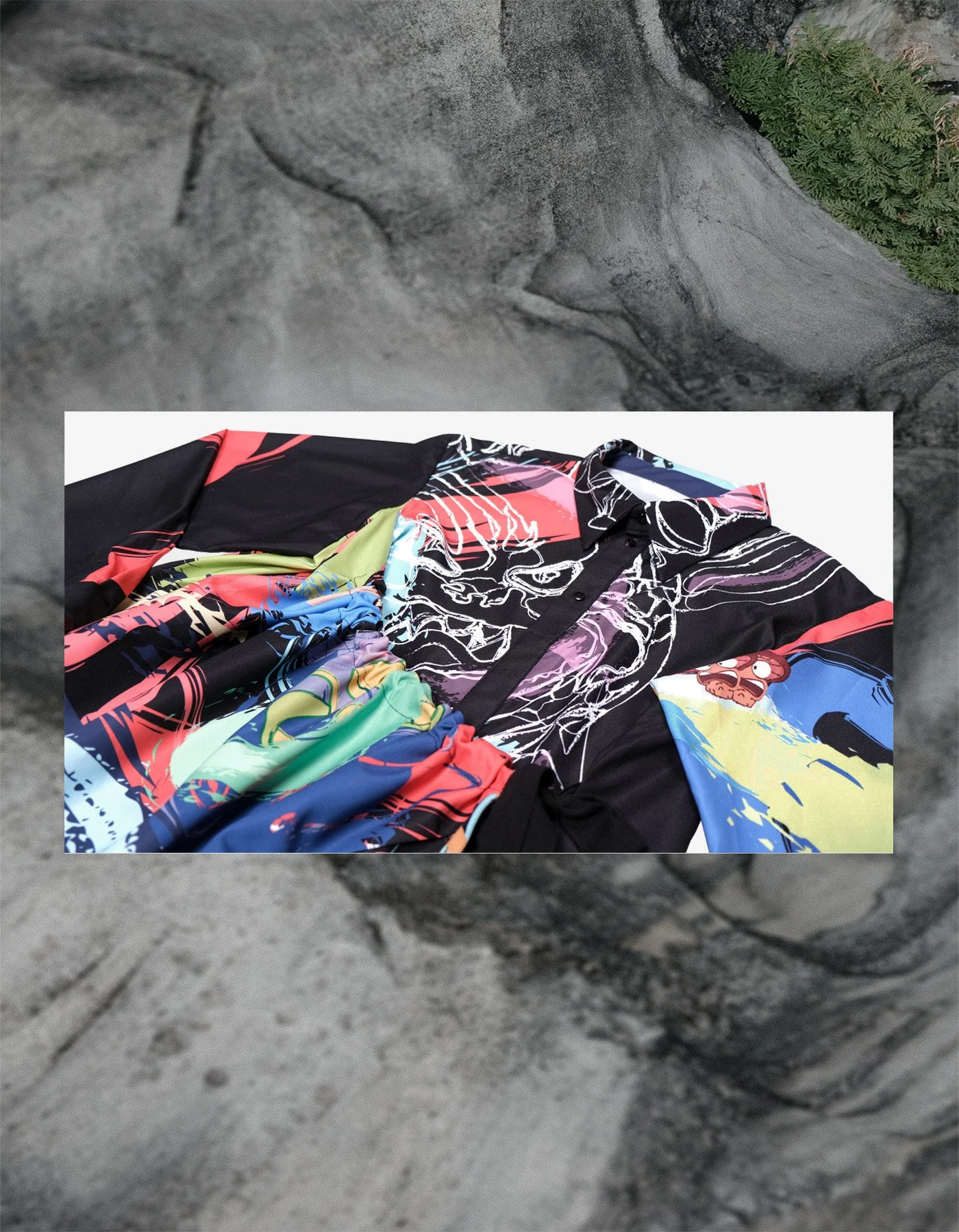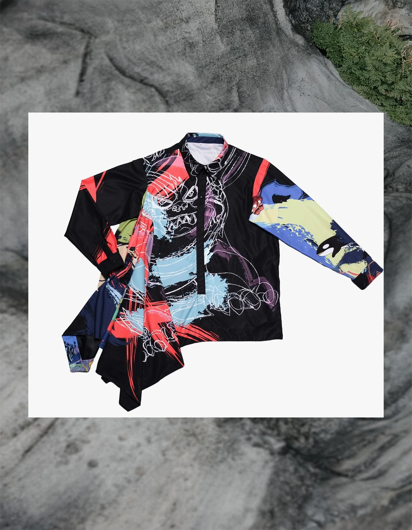 The print is a collaboration with famous Taiwan animation “Grand Mother & Her Ghost”, characters from the movie such as Kuro (the cat), Xiaobian (the snake), Apple (the soul of a little girl holding a doll) are used as elements in the print. By paying tribute to the film editing technology “Montage”, characters are combined with handwritten brushstrokes, which can be seen in the local folk beliefs in Taiwan, in a collage method to create a full and colorful print.