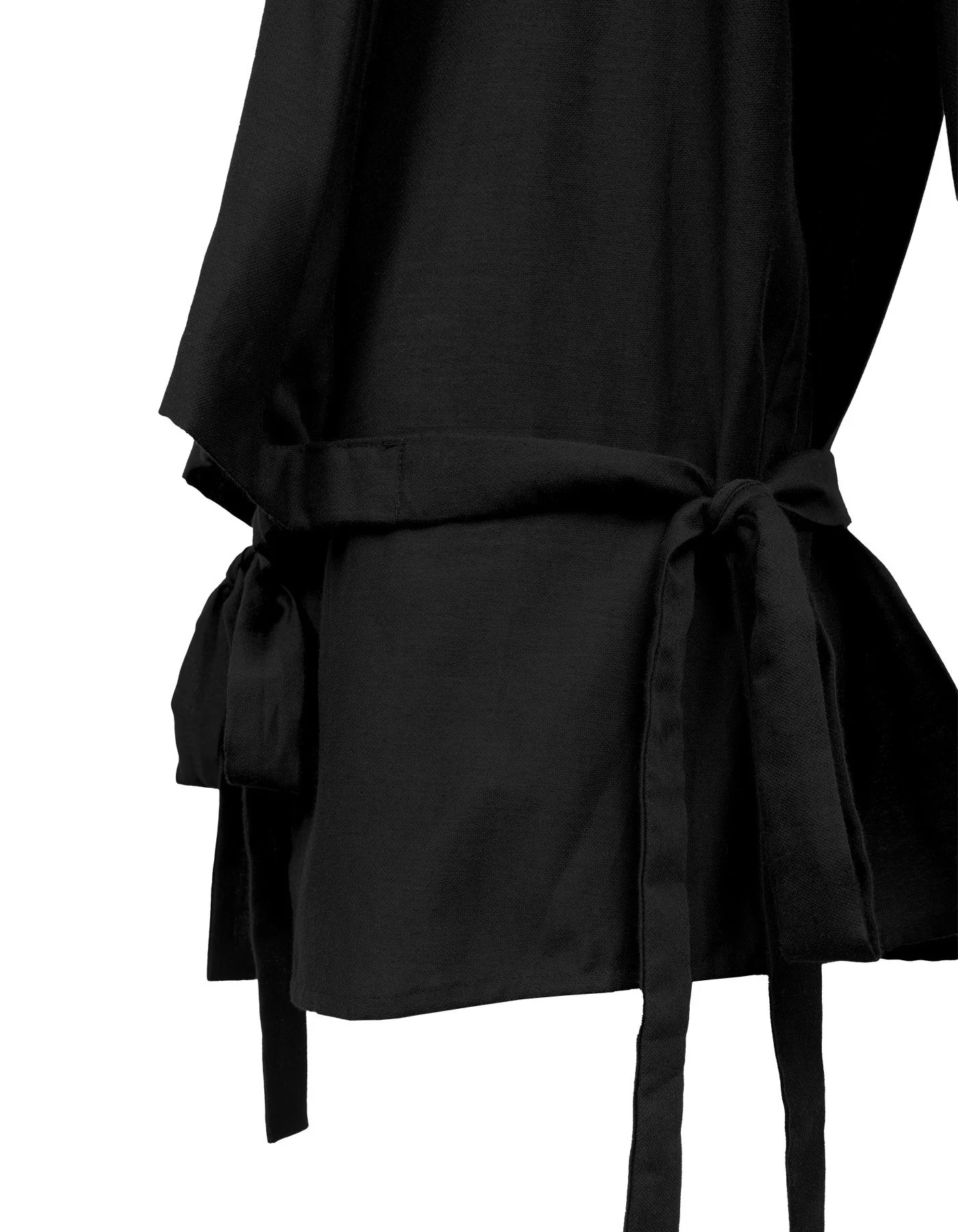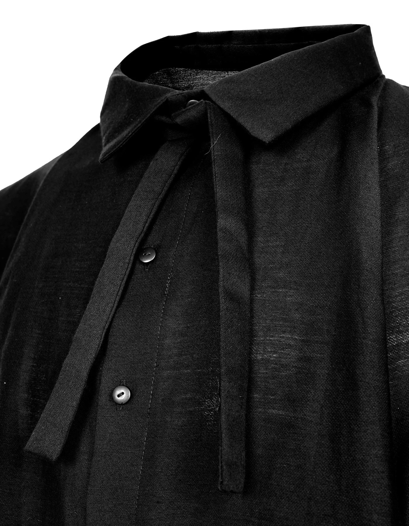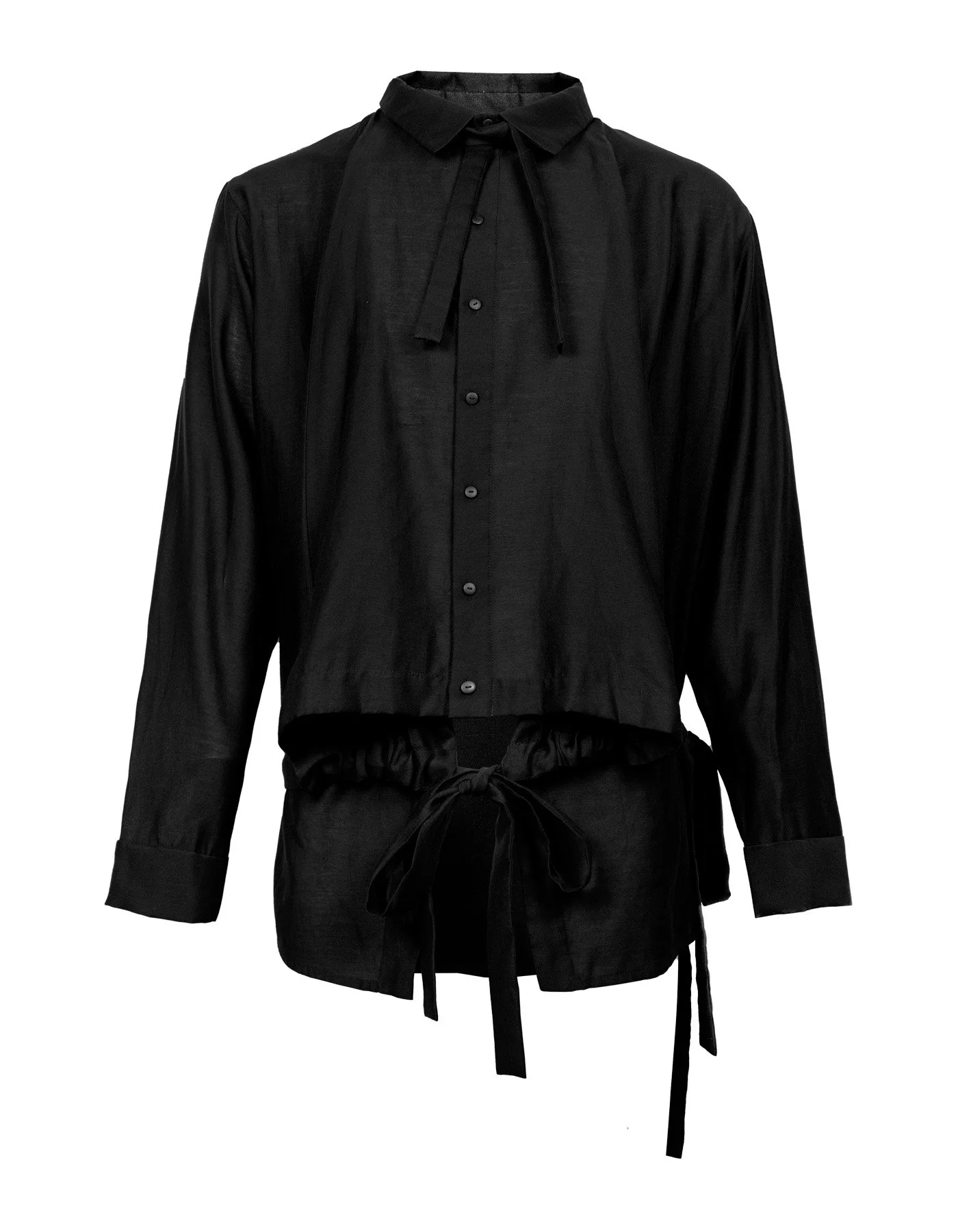 Taking inspiration from the formal shirt's visual silhouette, this shirt incorporates the undulating patterns of ocean waves in its design. Deconstructing the side panels and extending them into tie straps, the front hem structure mimics the visual dynamics of turbulent sea waves. The extended tie straps not only elegantly drape on either side but can also be skillfully tied back, accentuating the waistline. Additionally, at the deconstructed hem, two adjustable drawstrings are incorporated, offering the flexibility to either tie them up or gather the fabric for varied styling, depending on the occasion or personal preference. Noteworthy are the two tie straps extending from the collar, gracefully hanging in front to showcase a unique personality or skillfully tied for a sophisticated ambiance.