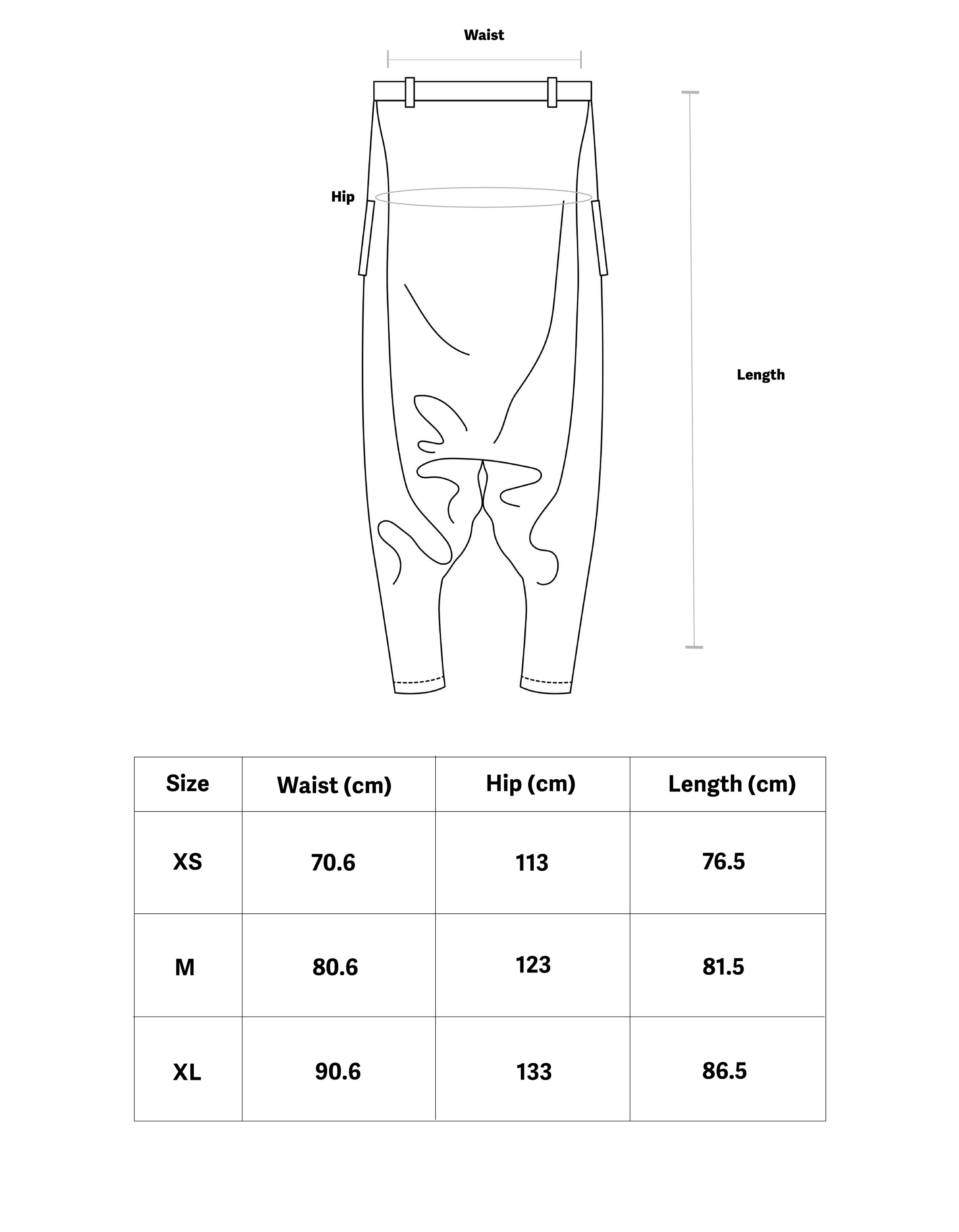 These trousers are based on the harem pant silhouette, with a deliberately low crotch design that creates a visually striking effect, resembling a skirt from the front. This adds a unique sense of layering to the look. The tapered design at the lower leg not only enhances the leg lines but also elongates the overall silhouette. The addition of side pockets combines both functionality and style, elevating the overall design and practicality of the piece.
